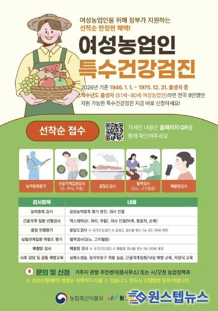 여성농업인 특수건강검진은 농작업으로 인해 발생할 수 있는 질환을 조기에 발견하고 건강 위험 요인을 체계적으로 관리하기 위한 사업이다. 검진 항목은 근골격계, 심혈관계, 골절·손상 위험도, 폐활량, 농약 중독 검사 등으로 구성되며, 검진 이후에는 사후관리 예방교육과 전문의 상담도 함께 제공된다.