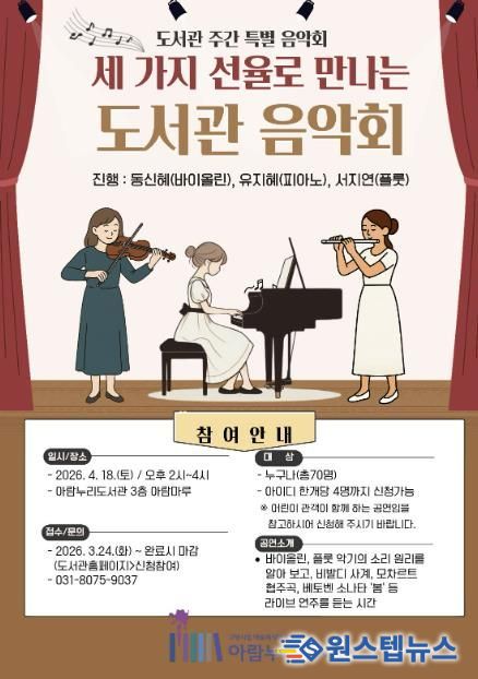 원스텝뉴스 천규영 기자 | 고양특례시 아람누리도서관은 오는 4월 18일 오후 2시 도서관 주간 맞이 특별 공연 ‘세 가지 선율로 만나는 도서관 음악회’를 개최한다.