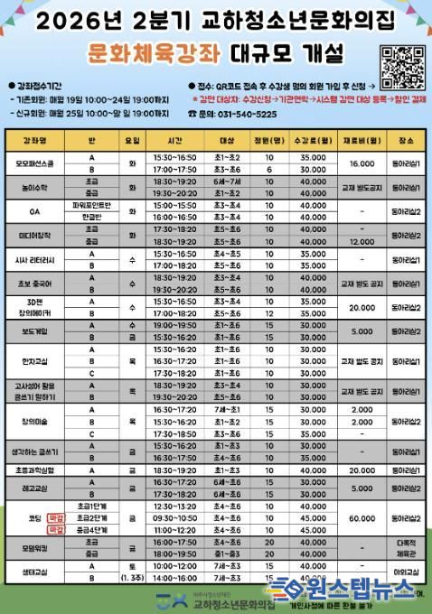 이와 함께 기존에 안정적으로 운영되며 높은 만족도를 보여준 ▲창의미술 ▲한자교실 ▲레고교실 ▲코딩 ▲생태교실 강좌 역시 지속적으로 운영되어, 청소년들에게 한층 더 넓고 깊이 있는 선택의 폭을 제공할 예정이다.