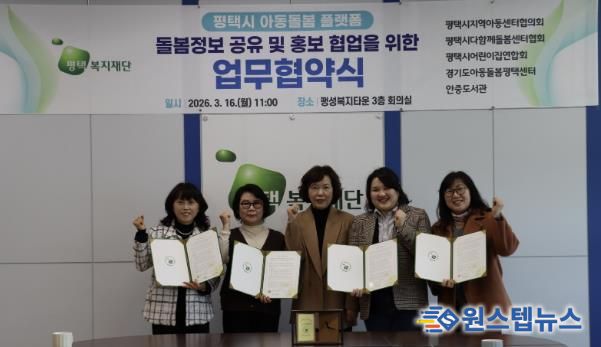 원스텝뉴스 이병희 기자 | 평택복지재단은 2026년 3월 16일 팽성복지타운에서 평택시 관내 아동돌봄 관련 5개 유관기관과 '평택시 아동돌봄 플랫폼'의 안정적인 운영 및 활성화를 위한 업무협약(MOU)을 체결했다.