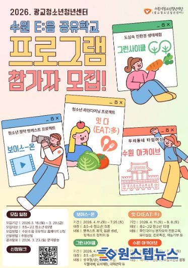 원스텝뉴스 이병희 기자 | 수원시청소년청년재단 광교청소년청년센터는 청소년 맞춤형 교육을 제공하는 ‘수원 E:음 공유학교’ 프로그램 참가자를 오는 2026년 3월 16일부터 20일까지 5일간 모집한다고 밝혔다.