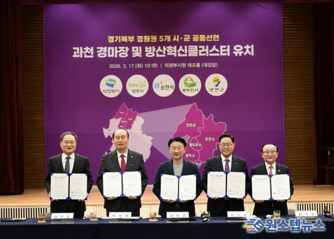 원스텝뉴스 이병희 기자 | 포천시는 17일 의정부시청 태조홀에서 경기북부 경원권 5개 시군(포천·의정부·양주·동두천·연천)과 함께 ‘과천경마공원 이전 및 방산혁신클러스터 유치’를 위한 공동선언식을 개최했다.