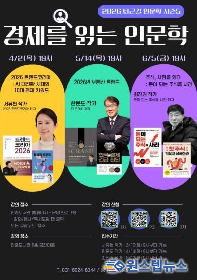 이번 강연은 ‘경제를 읽는 인문학’을 주제로 총 3회에 걸쳐 진행되며, 각 분야 전문가를 초청해 2026년 트렌드, 부동산, 주식 등 시민들의 실생활과 밀접한 경제 이슈를 인문학적 관점에서 풀어낼 예정이다.