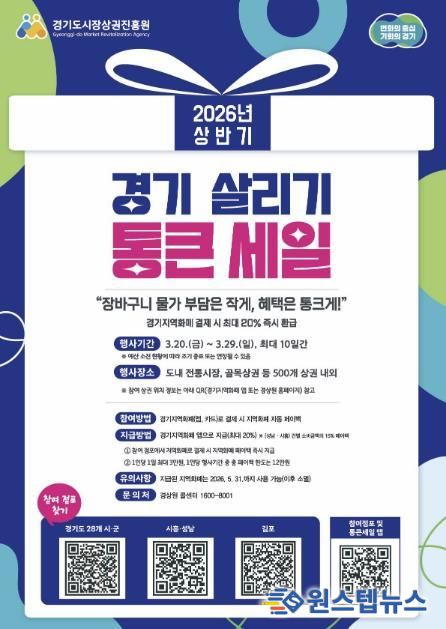 원스텝뉴스 이병희 기자 | 부천시는 관내 전통시장과 골목상권 등 39개 상권에서 3월 20일부터 29일까지 ‘2026년 상반기 경기 살리기 통큰 세일’이 열린다고 18일 밝혔다.