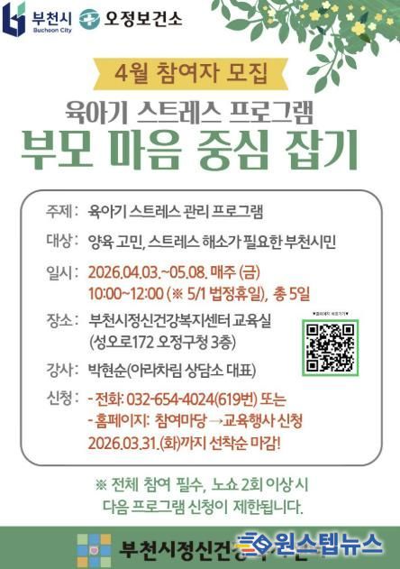 송정원 부천시보건소장은 “양육 과정에서 부모들이 겪는 스트레스와 감정을 건강하게 돌보는 것이 중요하다”며 “이번 프로그램이 부모들이 서로 공감하고 마음의 균형을 찾는 시간이 되길 바란다”고 말했다.