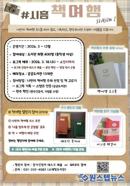 원스텝뉴스 이병희 기자 | 시흥시도서관은 시민의 독서 실천을 지원하고 일상 속 독서문화를 확산하기 위해 3월 18일부터 ‘2026 시흥 책여행(시즌2)’ 로그북을 배부하고, ‘책여행 로그북 챌린지’를 함께 운영한다.