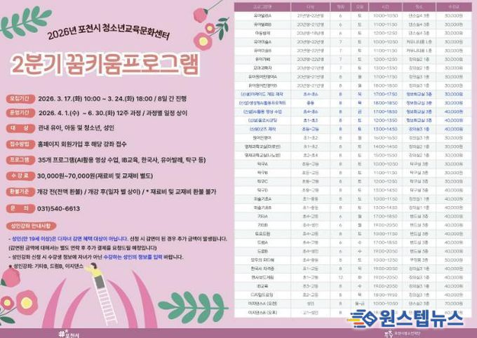 원스텝뉴스 이병희 기자 | 포천시청소년재단 포천시청소년교육문화센터는 관내 청소년과 지역 주민의 자기계발 및 역량 강화를 지원하기 위해 2026년 2분기 꿈키움프로그램 수강생을 모집한다.