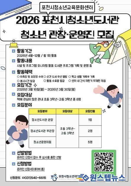 원스텝뉴스 이병희 기자 | 포천시청소년재단 포천시청소년교육문화센터는 청소년 참여형 도서관 운영을 위해 ‘2026년 포천시청소년도서관 청소년 관장 및 운영진’을 모집한다.