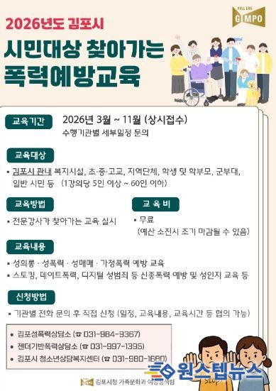 원스텝뉴스 이병희 기자 | 김포시는 시민의 건전한 성 가치관 형성과 폭력 예방 의식 확산을 위해 ‘2026년 김포시 시민대상 폭력예방교육’ 사업을 3월부터 11월까지 추진한다고 밝혔다.