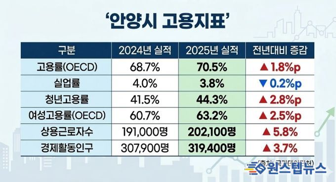 원스텝뉴스 이병희 기자 | 안양시의 지난해 고용률이 높아지고 실업률이 낮아지는 등 고용 지표가 전반적으로 크게 개선된 것으로 나타났다. 특히 전국적으로 청년 고용 증가세가 둔화되는 가운데 안양시는 지난해 청년 고용률이 상승하며 지역 노동시장의 회복세가 뚜렷하게 나타났다는 분석이다.