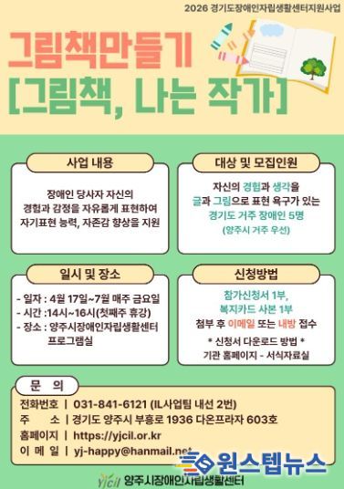 원스텝뉴스 이병희 기자 | 양주시장애인자립생활센터에서는 장애인의 문화·예술 참여 기회를 확대하고 자기 표현의 장을 마련하기 위해 그림책 만들기[그림책, 나는 작가] 참가자를 모집한다.