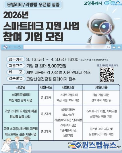 원스텝뉴스 이병희 기자 | 고양특례시와 고양산업진흥원이 스마트시티 및 스마트 모빌리티 분야 혁신 기술을 보유한 기업을 대상으로 스마트테크 혁신기업을
