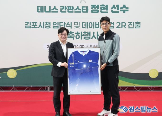 원스텝뉴스 이병희 기자 | 김포시는 17일 솔터실내테니스장에서 대한민국 테니스 스타 정현 선수의 김포시청 직장운동경기부 테니스팀 입단을 기념하고, 데이비스컵 2라운드 진출을 축하하는 행사를 개최했다.