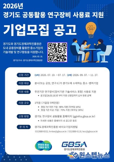 원스텝뉴스 이병희 기자 | 경기도와 경기도경제과학진흥원이 도내 중소·벤처기업의 연구개발(R&D) 경쟁력 강화를 위해 ‘2026년 경기도 공동활용 연구장비 사용료 지원 사업’을 추진한다.