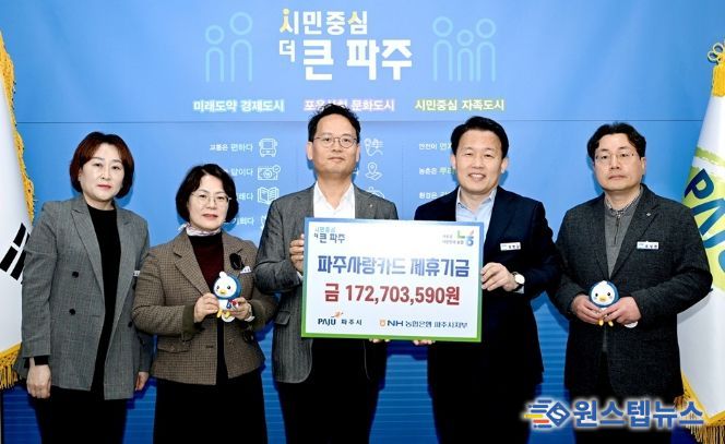 원스텝뉴스 이병희 기자 | 파주시는 지난 18일 엔에이치(NH)농협은행 파주시지부로부터 지난해 적립된 제휴카드 적립기금 172,703,590원을 전달받았다.