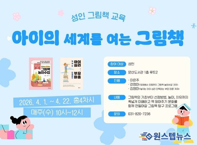 원스텝뉴스 이병희 기자 | 파주시 문산도서관은 그림책의 가치와 활용 방법을 이해하고, 지역사회에 책 읽어주기 문화를 확산하기 위한 그림책 교육 프로그램 ‘아이의 세계를 여는 그림책’을 오는 4월 1일부터 4월 22일까지 운영한다.