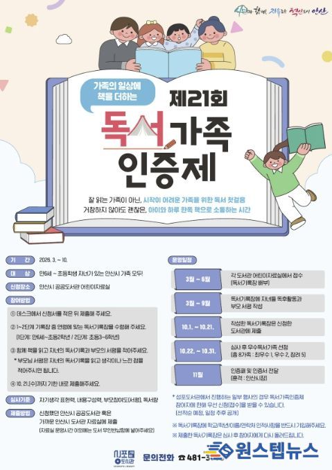 원스텝뉴스 이병희 기자 | 안산시 성포도서관은 오는 10월까지 가족의 일상에 책을 더하는 ‘독서가족인증제’를 운영한다고 19일 밝혔다.