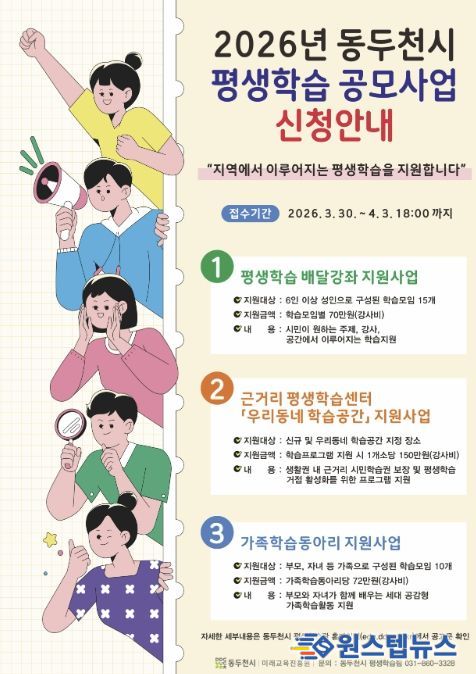 원스텝뉴스 이병희 기자 | 동두천시는 시민들의 자발적인 학습 문화를 확산하고 지역 평생학습 공동체를 활성화하기 위해 ‘2026년 평생학습 공모사업’ 신청을 오는 3월 30일부터 4월 3일까지 접수한다고 밝혔다.
