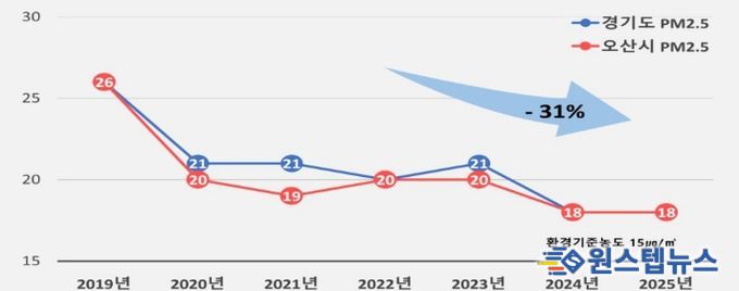 시에 따르면 오산시의 초미세먼지 연평균 농도는 2019년 이후 경기도 평균 수준을 유지하고 있으며, 보다 쾌적한 대기환경 조성을 위해 지속적인 관리와 개선 노력을 이어가고 있다. 시는 2026년 초미세먼지 연평균 농도 17㎍/㎥ 달성을 목표로 총력을 기울일 방침이다.