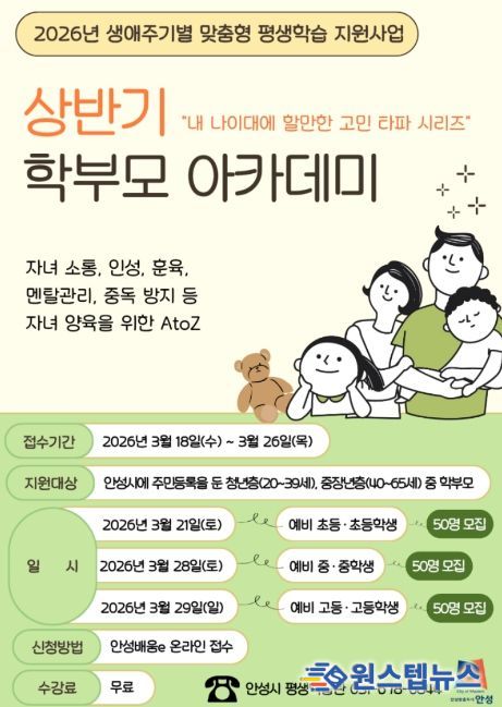 원스텝뉴스 이병희 기자 | 안성시는 시민의 생애주기별 학습 수요에 맞춘 평생교육 기회를 확대하기 위해 '2026년 생애주기별 맞춤형 평생학습 지원사업'의 일환으로 상반기 학부모 아카데미를 운영한다고 밝히고, 지난 3월 17일 1차 모집을 완료했다.