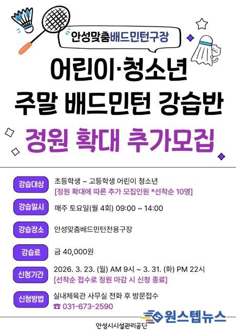 원스텝뉴스 이병희 기자 | 안성시시설관리공단은 안성 시민 생활체육 활성화를 위해 현재 운영 중인 주말 어린이・청소년 배드민턴 강습반 정원을 확대하고 추가 수강생을 모집한다고 밝혔다.