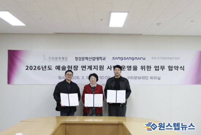 원스텝뉴스 이병희 기자 | (재)구리문화재단은 청강문화산업대학교, 문화공작소 상상마루와 3월 18일 업무 협약(MOU)을 체결하고, 예비 예술인의 현장 적응과 성장을 지원하는 현장 연계 프로그램을 본격 추진한다고 밝혔다.