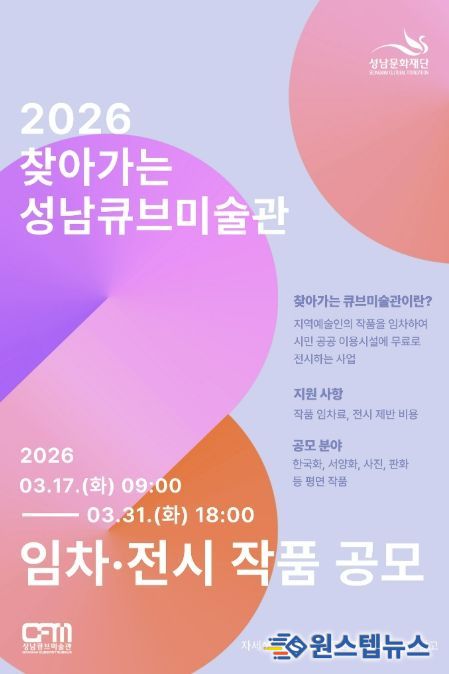 원스텝뉴스 이병희 기자 | 성남문화재단은 지역예술인의 창작 환경 지원을 다각화하고 시민들의 문화예술 향유기회를 확대하고자 ‘2026 찾아가는 성남큐브미술관’ 작품 임차 공모를 진행한다.