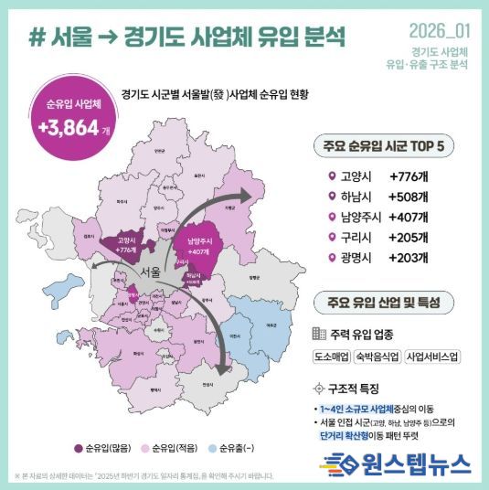 지난 1월 경기도일자리재단이 발표한 ‘경기도 사업체 유입·유출 구조 분석’에 따르면, 2022년부터 2025년까지 최근 3년간 서울에서 고양시로 순유입된 사업체 수는 총 776개로, 경기도 31개 시군 가운데 가장 많은 규모를 기록했다.