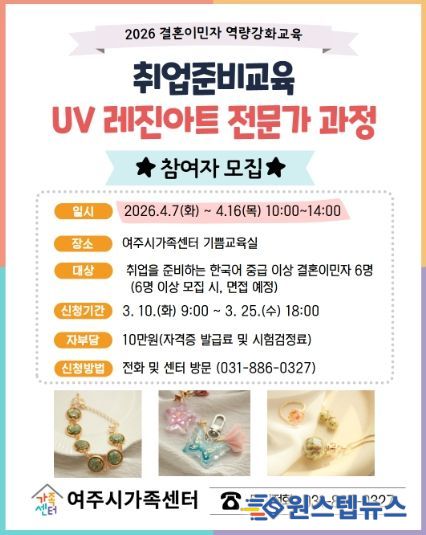 이번 교육은 취업을 희망하는 결혼이민자들이 자신의 적성과 관심 분야를 탐색하고 실질적인 취업 준비 역량을 키울 수 있도록 다양한 과정으로 구성됐다. 주요 교육 과정은 ▲UV 레진아트 전문가 과정 ▲의료통번역사 자격 취득 과정 ▲운전면허 필기(학과)반 ▲취업 기초소양교육으로 운영될 예정이다.