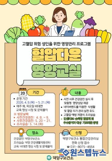 아울러 오는 5월 14일 고혈압 예방을 위한 저염식 조리실습이 덕양건강생활지원센터에서 진행된다. 해당 실습은 선택적 프로그램으로, 올바른 식생활을 직접 체험하고 실천 능력 향상에 도움을 줄 것으로 기대된다.