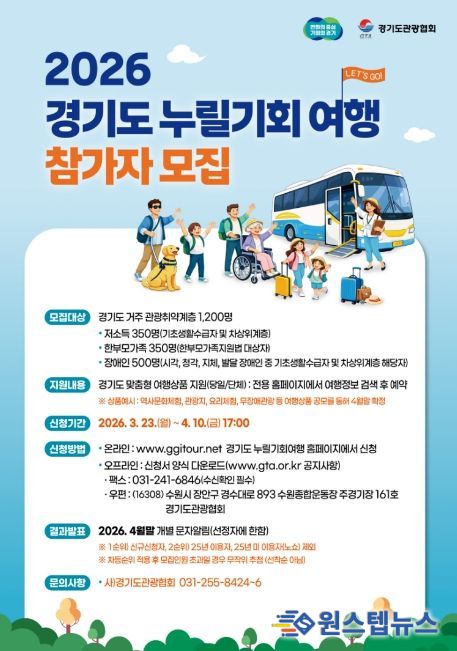원스텝뉴스 이병희 기자 | 경기도가 3월 23일부터 4월 10일까지 관광취약계층의 무료 여행을 지원하는 ‘경기도누릴기회여행’ 참여자 1,200명을 모집한다.