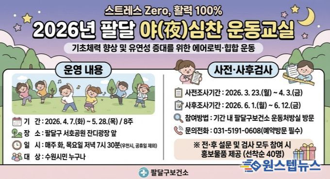 원스텝뉴스 이병희 기자 | 수원시 팔달구보건소가 시민들의 건강 생활 실천을 돕고 비만율을 낮추는 프로그램 ‘2026년 팔달 야(夜)심찬 운동교실’을 운영한다.