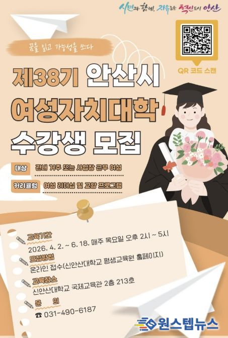원스텝뉴스 이병희 기자 | 안산시는 지역 여성의 역량 강화와 리더십 함양을 위한 ‘제38기 안산시 여성자치대학’ 수강생을 모집한다고 20일 밝혔다.