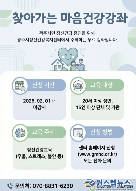 원스텝뉴스 이병희 기자 | 광주시정신건강복지센터는 지역 내 기관 및 단체를 대상으로 정신건강 인식 향상과 정신질환 예방을 위한 ‘2026년 찾아가는 마음 건강 강좌’를 오는 11월까지 운영한다고 20일 밝혔다.