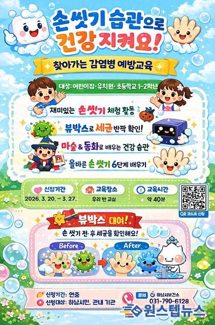 원스텝뉴스 이병희 기자 | 하남시보건소는 오는 4월 6일부터 10월 2일까지 관내 어린이 대상 ‘손 씻기 교육’을 운영하며, 3월 20일부터 27일까지 관내 교육기관을 대상으로 네이버 폼을 통해 교육 신청을 받는다고 밝혔다.