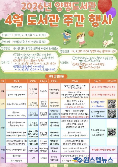 원스텝뉴스 이병희 기자 | 양평군은 제62회 도서관의 날·도서관 주간(4월 12일~4월 18일)을 맞아 양평도서관에서 어린이부터 성인까지 전 연령층이 참여할 수 있는 공연, 강연, 체험 등 다채로운 행사를 운영한다.