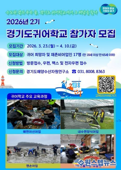 원스텝뉴스 이병희 기자 | 경기도해양수산자원연구소는 귀어 희망자의 어촌 정착을 지원하기 위해 4월 10일까지 ‘2026년 2기 귀어학교’ 교육 프로그램 참가자를 모집한다.