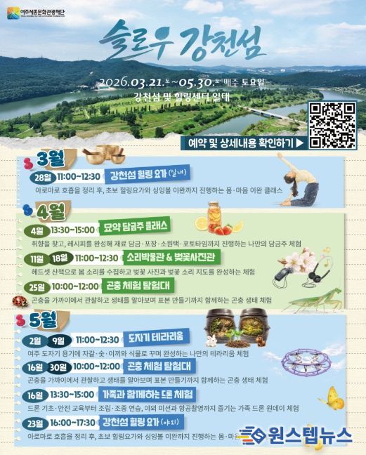 ‘슬로우 강천섬’은 느리게 머물고 천천히 즐기는 강천섬만의 여행 감성을 담아 구성한 것이 특징으로 3월 아로마 호흡과 싱잉볼 이완을 접목한 '강천섬 힐링 요가'를 시작으로, 4월에는 '묘약 담금주 클래스', '소리박물관 & 벚꽃사진관', '곤충 체험 탐험대' 5월에는 제38회 여주도자기축제와 연계한 '도자기 테라리움'과 '가족과 함께하는 드론 체험' 등 가족 단위 방문객과 체험 수요를 반영한 프로그램이 이어질 예정이다.