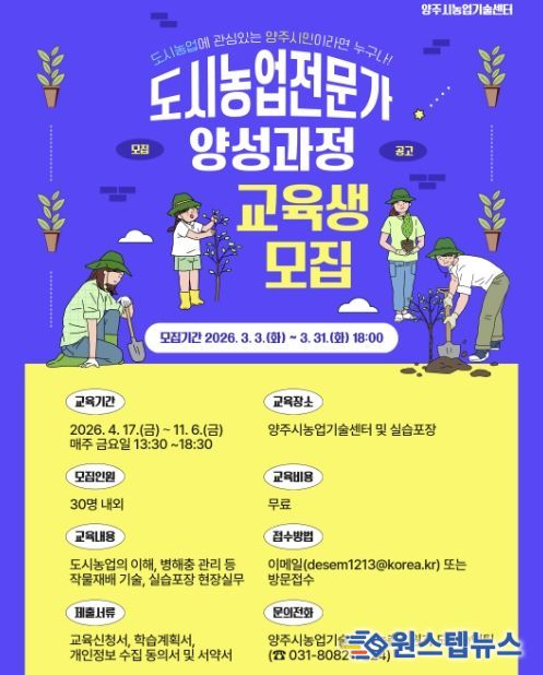 원스텝뉴스 이병희 기자 | 양주시는 도시농업 활성화와 전문인력 양성을 위해 오는 3월 31일까지 ‘2026년 도시농업전문가 양성과정’ 제8기 교육생을 모집한다.