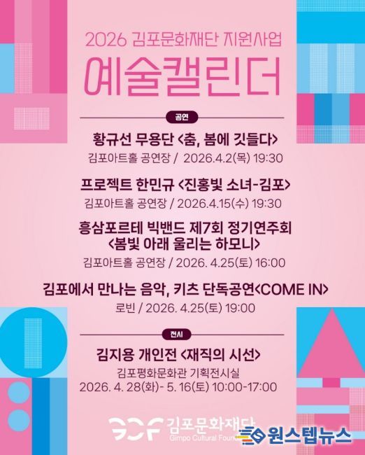 원스텝뉴스 이병희 기자 | (재)김포문화재단은 지역 예술인의 예술활동 및 창작을 지원하는 '2026년 김포예술활동지원사업'과 '경기예술활동지원사업 '모든예술31'' 최종 선정 결과, 총 74건의 다양한 예술활동이 김포 전역에서 펼쳐진다고 밝혔다.
