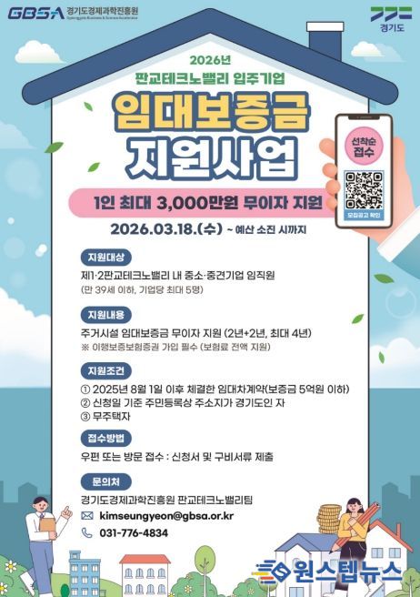 ‘2026년 판교테크노밸리 입주기업 임대보증금 지원사업’은 제1·2판교테크노밸리 입주 중소·중견기업 재직자를 대상으로 최대 3천만 원의 임대보증금을 최장 4년간 무이자로 지원한다.