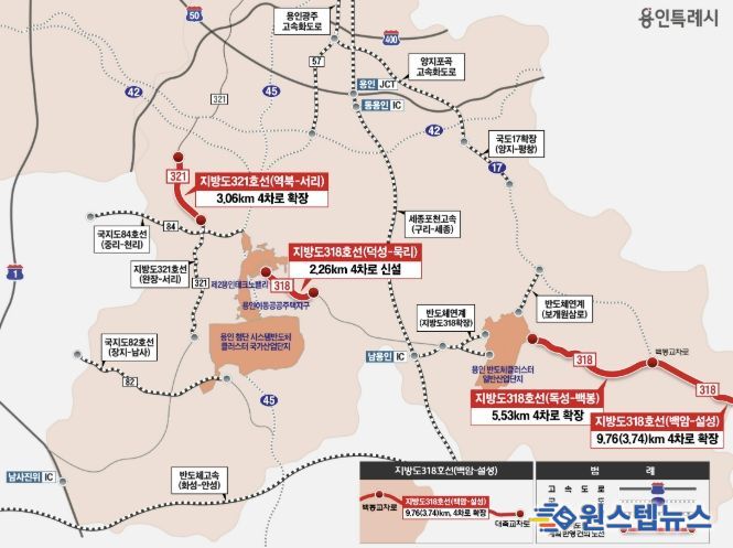 지방도 318호선 독성~백봉, 용인 백암~이천 설성 구간 확장 사업은 각각 반도체클러스터 일반산업단지 동측에서 백암면 백봉교차로까지 5.53㎞, 백암면 백봉교차로에서 이천 설성면 대죽교차로까지 9.76㎞ 등 총 15.3㎞ 구간을 4차로로 확장하는 공사다.