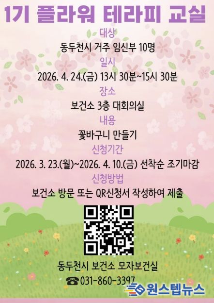 이번 플라워테라피 태교 교실은 4월 24일 보건소 3층 대회의실에서 진행하며 신청 기간은 오는 10일까지로 동두천시 보건소에 등록된 임신부를 선착순 모집한다.