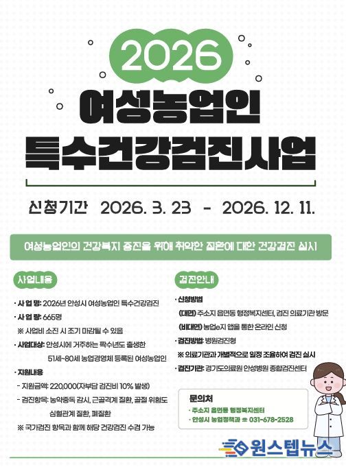 원스텝뉴스 이병희 기자 | 안성시는 여성농업인의 농작업 관련 질환을 예방하고 건강한 영농 환경을 조성하기 위해 ‘2026년 여성농업인 특수건강검진 사업’을 오는 3월 23일부터 본격 추진한다고 밝혔다.