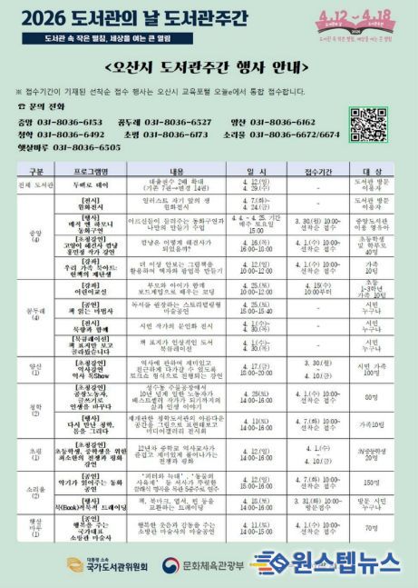 원스텝뉴스 천규영 기자 | 오산시는 2026년 도서관의 날(4월 12일)과 도서관주간(4월 12일~4월 18일)을 맞아 시민 누구나 참여할 수 있는 다양한 독서문화 행사를 운영한다고 밝혔다.