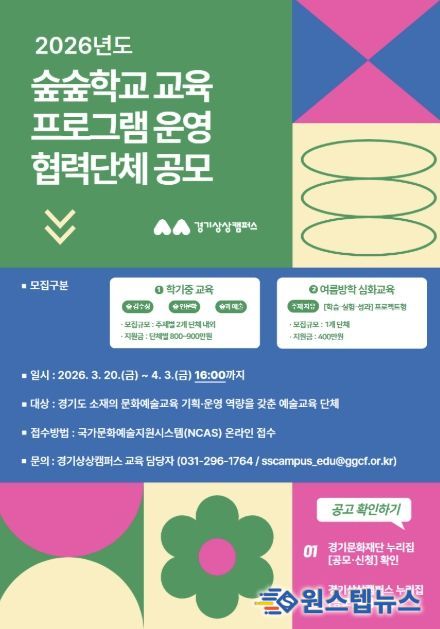 원스텝뉴스 이병희 기자 | 경기문화재단 경기상상캠퍼스는 3월 20일부터 4월 3일 16시까지 2026 경기상상캠퍼스 ‘숲숲학교’ 교육 협력단체를 공개 모집한다.