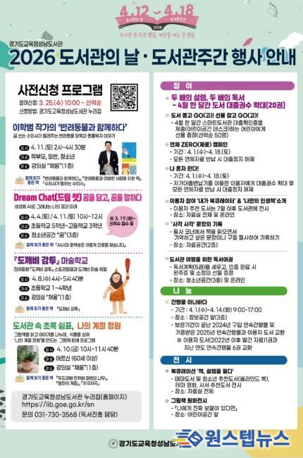 원스텝뉴스 이병희 기자 | 경기도교육청성남도서관이 2026년 도서관의 날(4월 12일)과 도서관 주간(4월 12일~18일)을 맞아 다양한 독서·문화행사를 운영한다.