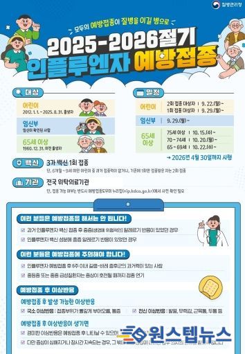 2025-2026절기 독감 무료 접종 대상은 ▲어린이(생후 6개월~13세 이하) ▲임신부 ▲65세 이상 어르신(1960.12.31. 이전 출생자)이다. 별도의 예약 없이 신분증을 지참하여 지정 위탁의료기관에서 접종할 수 있으며, 해당 기관정보는 예방접종도우미 누리집에서 확인할 수 있다.