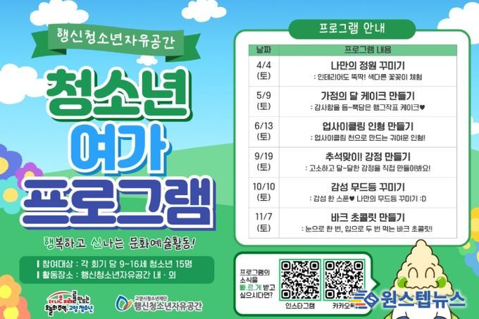 행신청소년자유공간 이재신 센터장은 “청소년들이 일상에서 다양한 문화·예술 활동을 경험하며 건강하게 성장할 수 있도록 지속적으로 지원할 계획”이라며 “앞으로도 청소년의 눈높이에 맞는 다채로운 여가 프로그램을 운영해 나가겠다”라고 전했다.