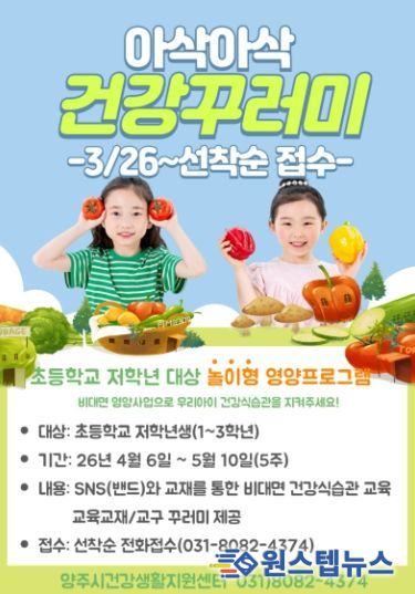 참여 신청은 오는 3월 26일부터 양주시 건강생활지원센터를 통해 전화로 접수할 수 있다. 대상은 관내 초등학교 저학년 학생이며, 선착순으로 모집이 진행돼 조기 마감될 수 있다.